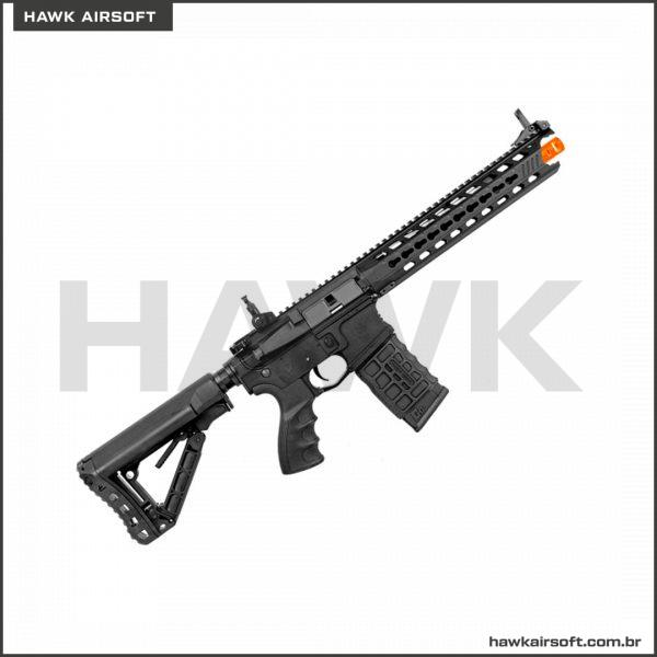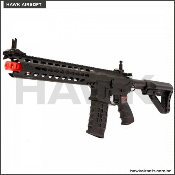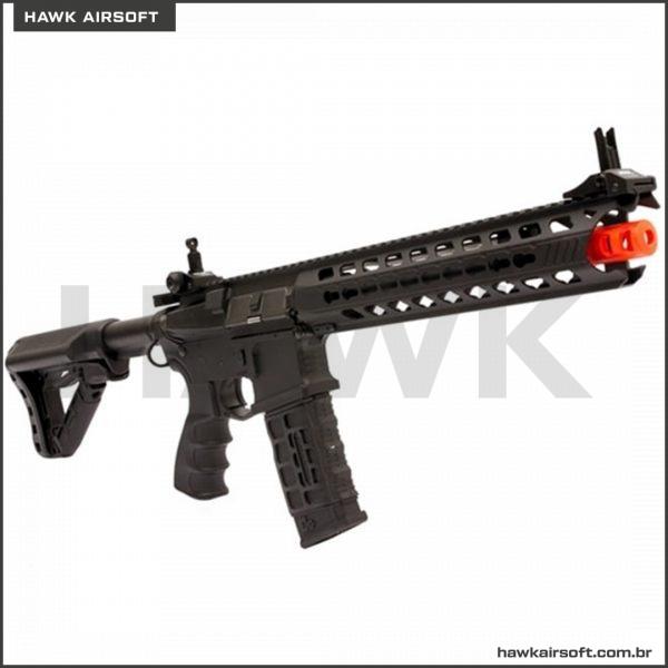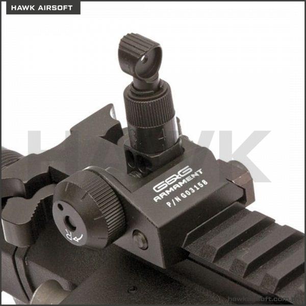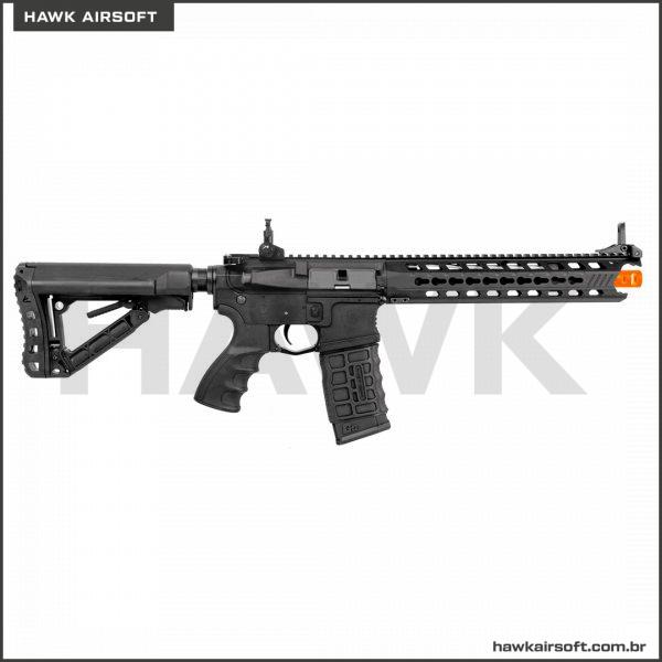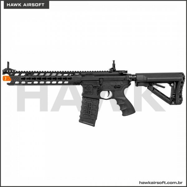 RIFLE DE AIRSOFT CM16 PREDATOR possui handguard em alumínio CNC em sistema KEYMOD de 12 polegadas, e miras rebatíveis com ajuste de elevação. O retém do carregador é ambidestro. O mag incluído é de alta capacidade, pois é padrão Hicap de 350bbs modelo G&G. Além disso essa AEG inclui MOSFET e GATILHO ELETRÔNICO, com certeza um dos melhores rifles da atualidade.