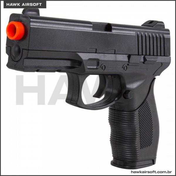 Pistola 24/7 com ação por mola (Spring), fabricada em polímero na cor preta pela Vigor, modelo V310 6mm.