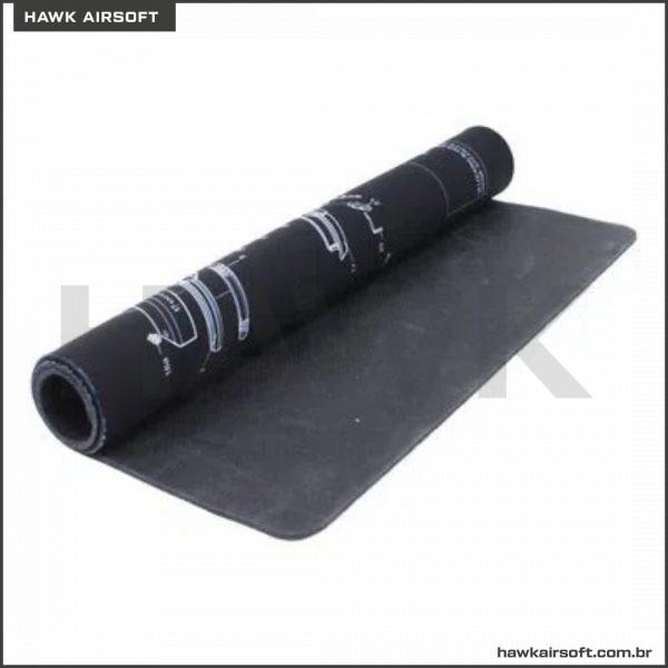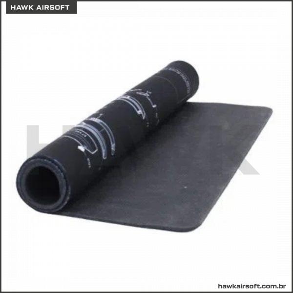A Gunmat conta com a parte inferior em neoprene, justamente para ajudar na fixação junto a mesa e evitar movimentos.