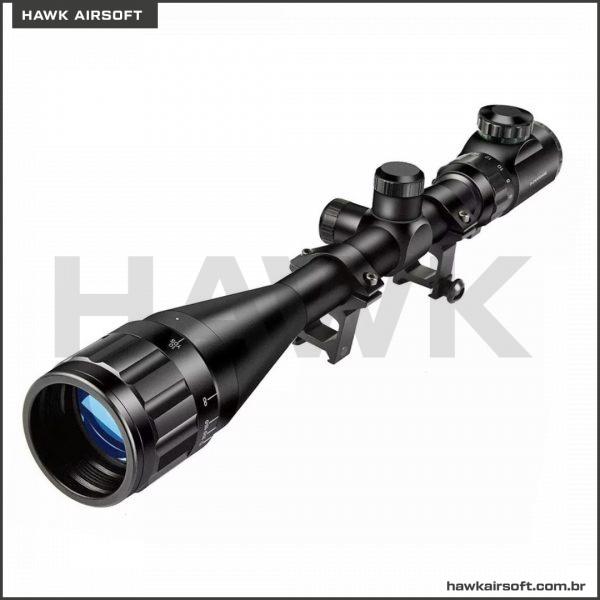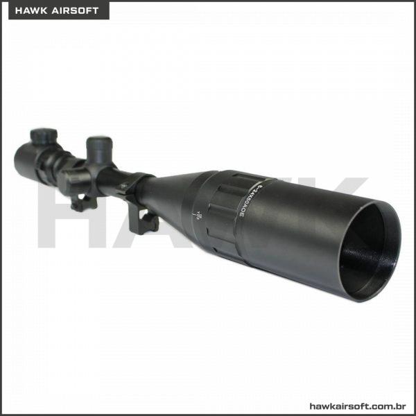 RETÍCULO: De Cor Preta (visível desligado) podendo ser iluminado nas cores verde ou vermelha, bastando girar a chave de iluminação que possui 5 níveis de intensidade.