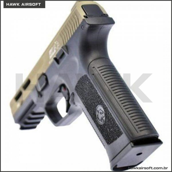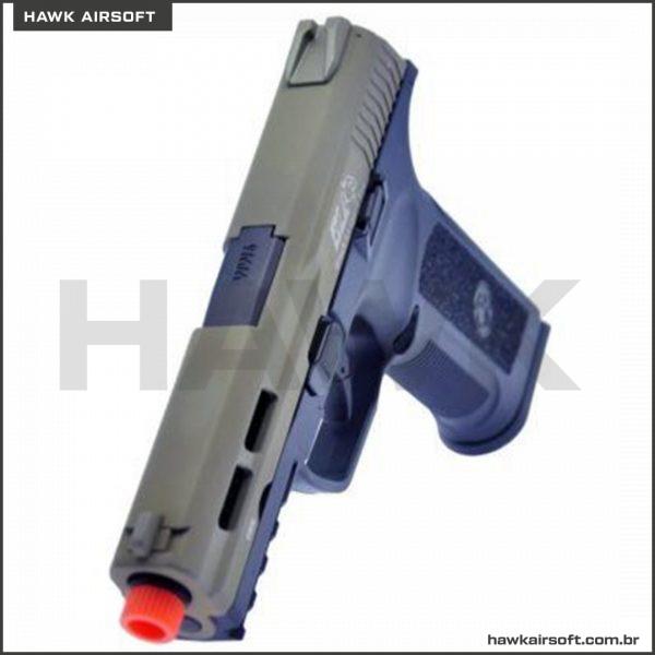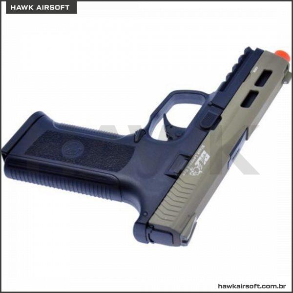 A pistola Airsoft XAE Gás GBB Blowback é uma oferta sólida e barata da ICS. Mesmo com o baixo preço, a pistola ICS está repleta de características que a tornam uma opção verdadeiramente competitiva no mercado. O ICS XAE é um design “Striker fired” que tem compatibilidade com os sempre comuns coldres da série G. Portanto os recursos externos são um slide portado leve para ciclismo de alta velocidade, um trilho picatinny padrão na estrutura inferior para a fixação de lanternas e alças traseiras intercambiáveis na alça para caber em diferentes tamanhos de mão de tiro, bem como controles ambidestros completos.