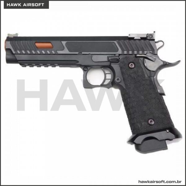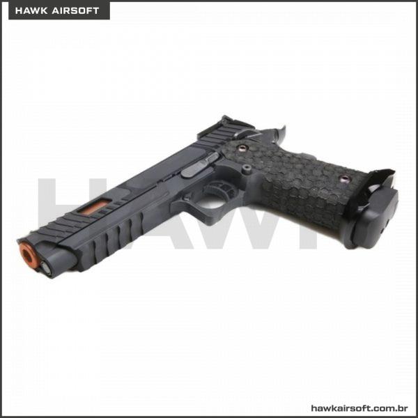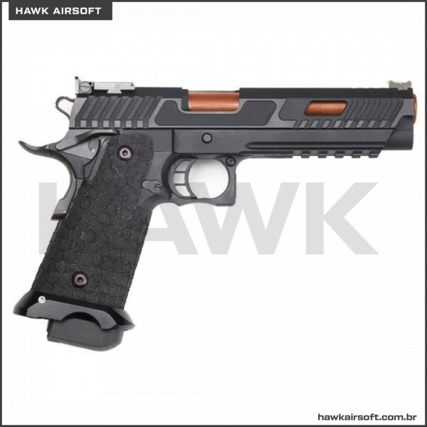 A Baba Yaga 1911 Hi-Capa Series é a próxima fera tática a chegar ao mercado! Com a durável estrutura metálica completa e slide, esta pistola pode levar uma surra! A textura pontilhada lhe dará uma aderência perfeita sem usar luvas. Os cortes deslizantes permitem que você monte a arma e pressione a verificação muito mais facilmente. Isso emparelhado com os cortes da janela clareia o slide e aumenta a taxa de ciclo. A mira frontal de fibra ótica facilita a aquisição de alvos e o magwell alargado ajuda a recarregar mais rapidamente. O trilho picatinny de cinco slots é cortado na armação e é capaz de montar uma infinidade de lanternas e lasers na armação robusta.