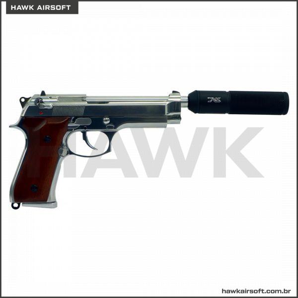 PISTOLA DE AIRSOFT GBB GREEN GÁS SRC SR-92 SILVER WOOD COM SUPRESSOR MOCK (AUMENTO DE FPS)