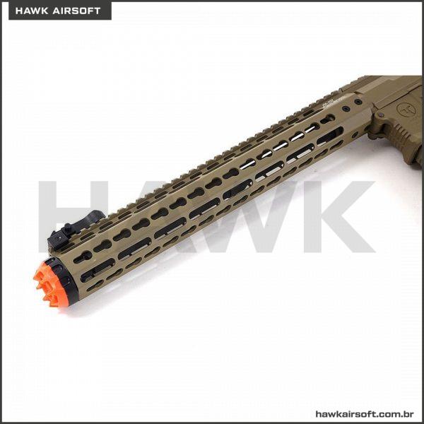 O hand guard de metal do Rifle Airsoft Ares Amoeba M4 AEG AM-016 conta com um sistema Keymod, assim as secções KeyMod estão localizadas na posição 3, 6 e 9 horas. O trilho é montado no receptor superior com 6 parafusos sextavados. O barril passa livremente pelo guarda-mão e termina com um bastidor de chamas. O trilho KeyMod “Octarms” é usinado em CNC com liga de alumínio 6063 e é muito leve.