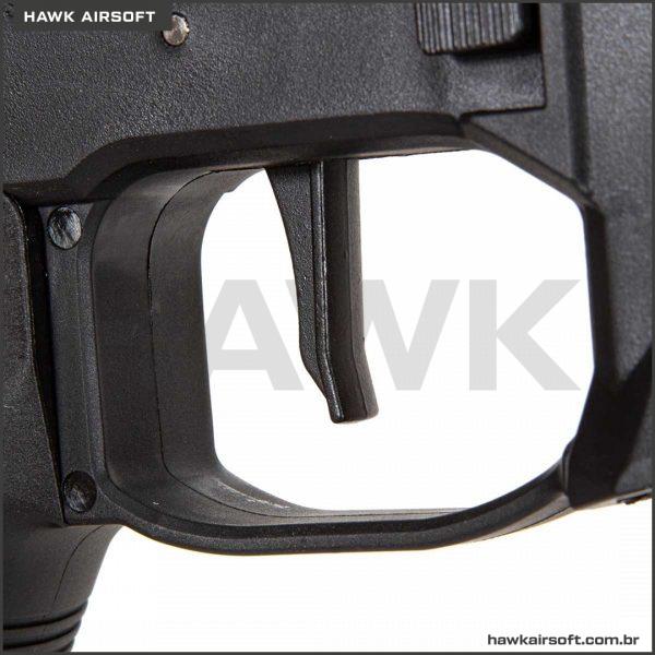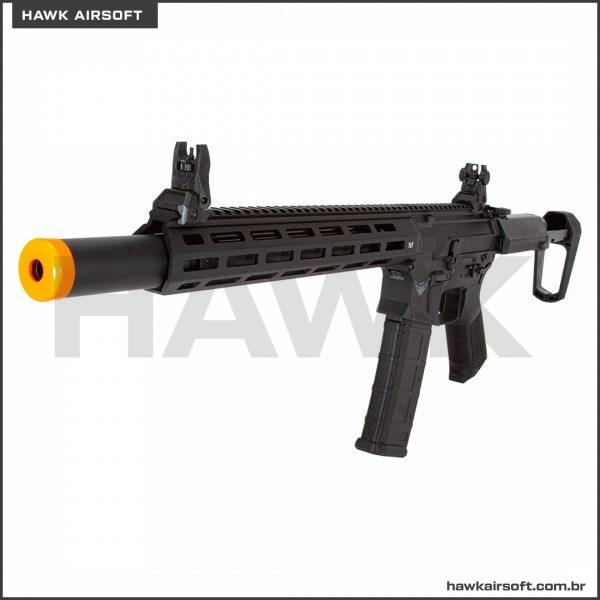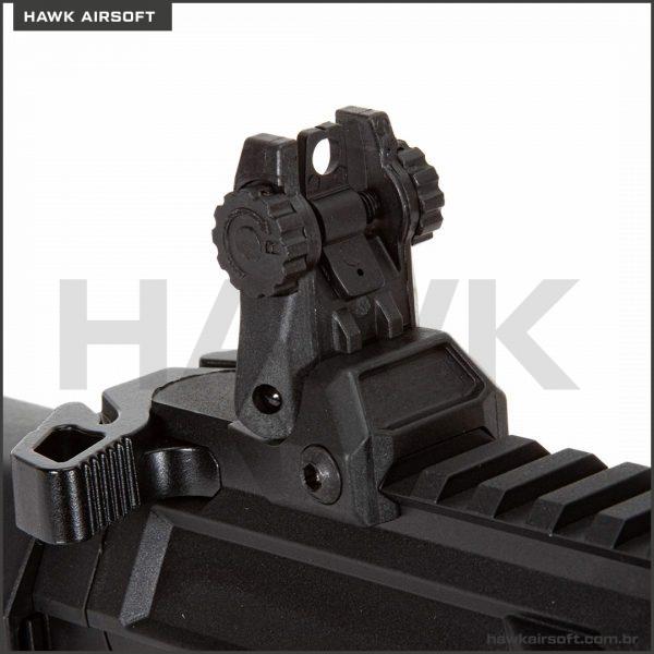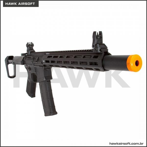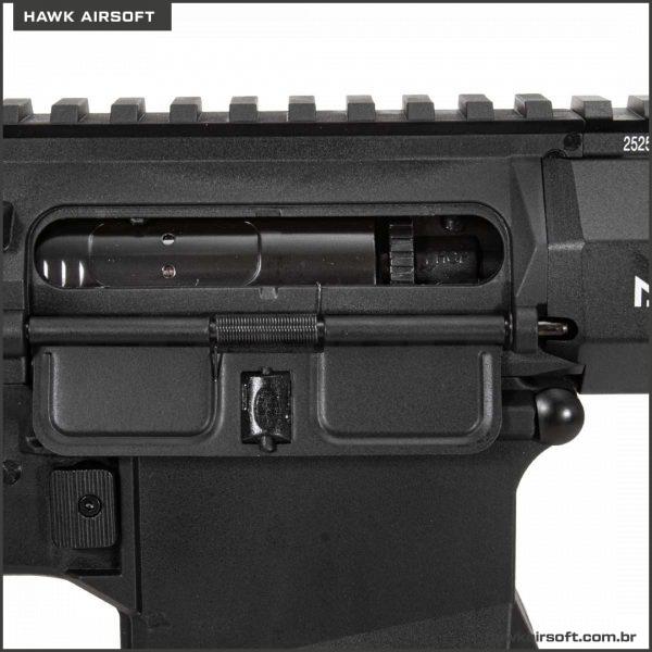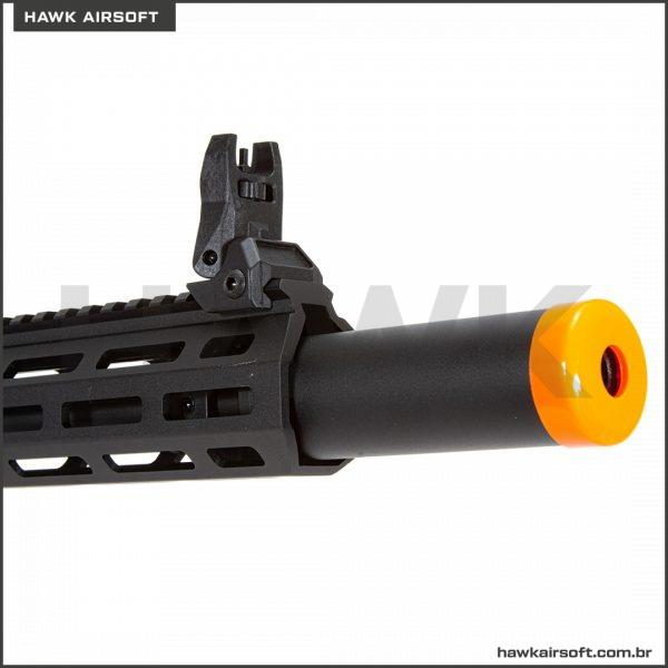 Com um visual muito bonito e agressivo, possui handguard do tipo MLOK com entrada para zarelho QD.