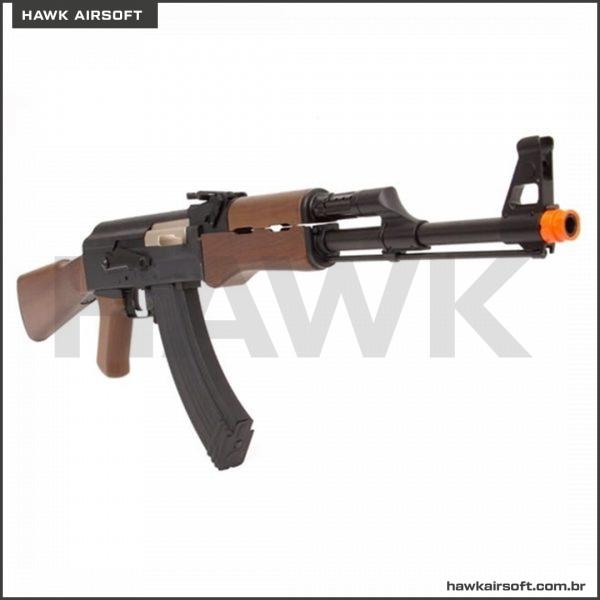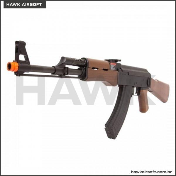 É uma arma inspirada no fuzil AK-47, conhecida também como Kalashnikov, um fuzil de assalto criado em 1947 por Mikhail Kalashnikov e produzido na União Soviética pela IZH. O AKMS LCKMS é um rifle Semi Metal, sendo as engrenagens de metal e o restante de polímero, o que faz dela uma arma com peso e tamanhos realistas, além de muitíssimo resistente. A coronha, o grip e o hand guard imitam a madeira dando um efeito mais próximo a arma real, mas não são de metal. Esteja pronto para se surpreender com a RK47 Imitation Wood! É uma AEG, por isso usa bateria que é conectada na parte de cima do corpo, basta apenas desencaixar a tampa e conectar a bateria. O indicado é que faça uso de uma bateria 7.4v ou 11.1v que não vem inclusa. Possui modo de disparo semi, automático e SAFE, o Gearbox é V3. Atira com muita precisão e muitíssima velocidade. Para maior segurança, deixe sempre seu equipamento no modo SAFE (travado) quando não estiver usando. Assim, você estará prevenindo acidentes e que a mola fique tensionada e a arma perca a força. Se você procura por diversão com tiros contínuos esse é o tipo de arma de airsoft perfeita para você! É só puxar o gatilho e mandar ver! O hop-up é de fácil e rápido acesso, permitindo maior facilidade no ajuste. O sistema integrado de hop-up é um mecanismo que faz com que, ao disparar, a munição saia “girando” para cima, tendo um maior alcance e melhor desempenho em tiros de longa distância. Seu magazine standart tem capacidade para 65 BBs. A bateria é acoplada dentro do stock da coronha, podendo ser facilmente retirada. Sua velocidade é de 350~390 FPS com BBs 0,20g. E conta também com um suporte para bandoleira. A alça de mira é rebatível e ajustável com 10 níveis de ajuste, enquanto que a massa de mira é fixa. Um rifle fantástico para qualquer nível de conhecimento em airsoft!