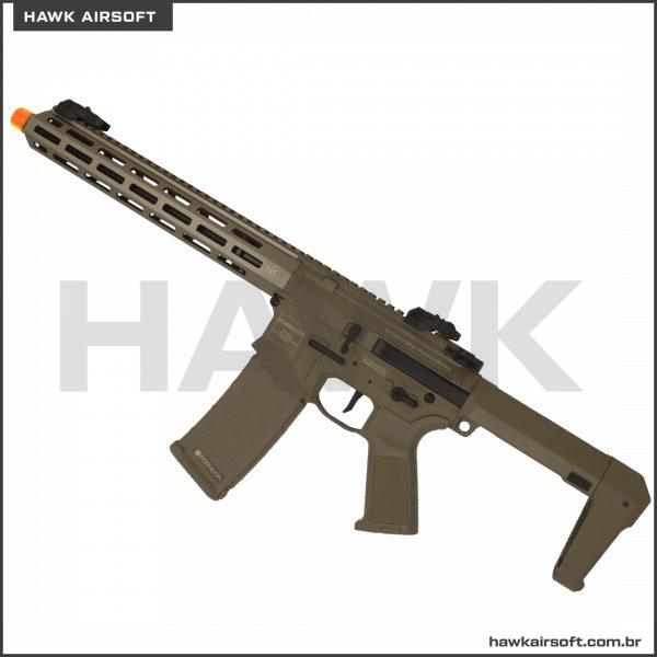 O corpo é feito de polímero resistente, com marcações de poseidon. O handguard M-LOK é em polímero com comprimento de 7 polegadas.
