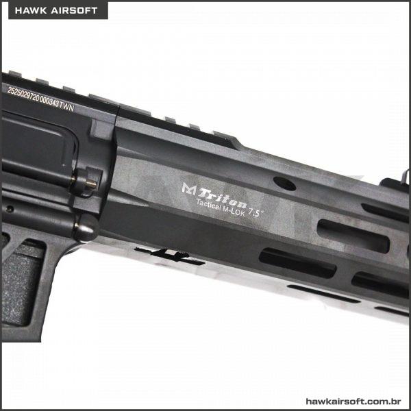 O corpo é feito inteiramente de metal, com marcações de poseidon em baixo relevo. O handguard M-LOK é em metal com comprimento de 7,5 polegadas.
