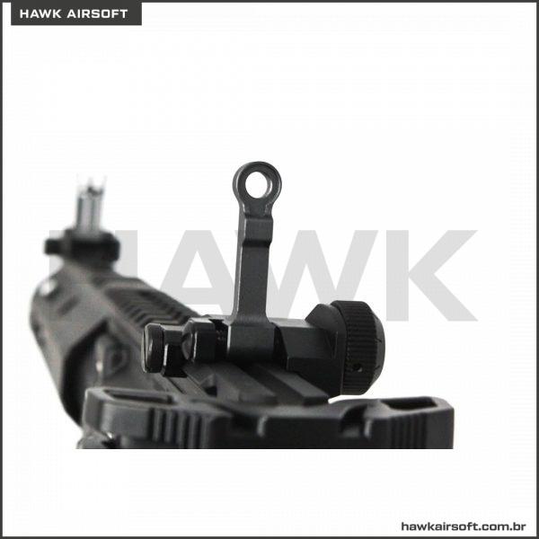 A presença do sistema de mira flip-up estilo KAC permitirá que você mantenha uma aparência aerodinâmica ao mesmo tempo em que é agradável mirar. Observe a presença de um seletor ambidestro, um gatilho direito, um stick retrátil em 3 posições. O magazine que acompanha é um midcap 140 rounds.