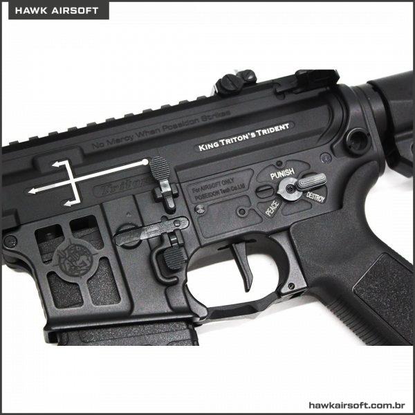 Os rifles Poseidon Triton são réplicas de airsoft AEG de nova geração que unem um lindo design com grande precisão. O fosso do magazine possui recorte openwork como estilo de armas de fogo de última geração. Corpo estilizado e com design moderno e gravações em baixo relevo da logo Poseidon e gravações à laser do modelo e desenho do tridente no upper receiver. O seletor de disparo também utiliza um design único com as marcações “Peace, Punish e Destroy” para os modos “Safe, Semi e Auto”.