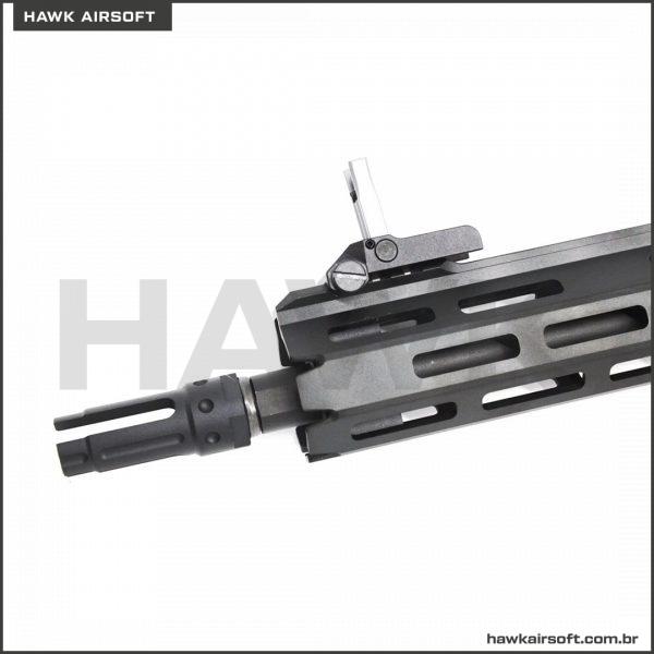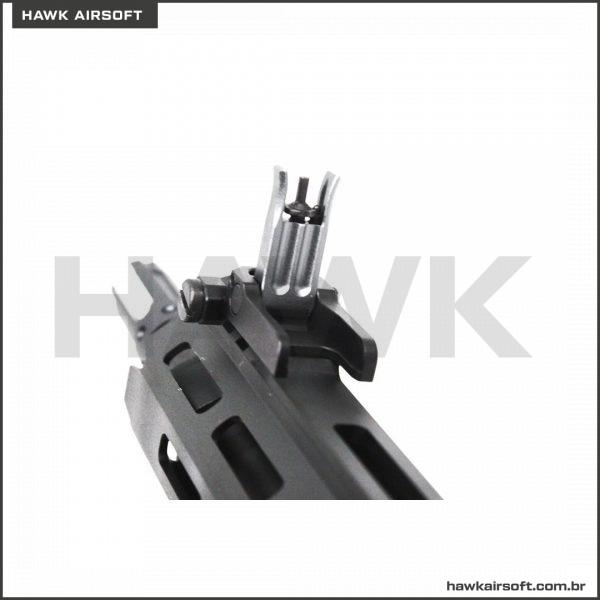 A presença do sistema de mira flip-up estilo KAC permitirá que você mantenha uma aparência aerodinâmica ao mesmo tempo em que é agradável mirar. Observe a presença de um seletor ambidestro, um gatilho direito, um stick retrátil em 3 posições. O magazine que acompanha é um midcap 140 rounds.
