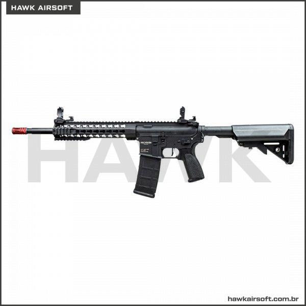 Conta com sistema integrado de hop-up, rotativo do gênero ProWin, GearBox com rolamento de 8mm e pistão reforçado.