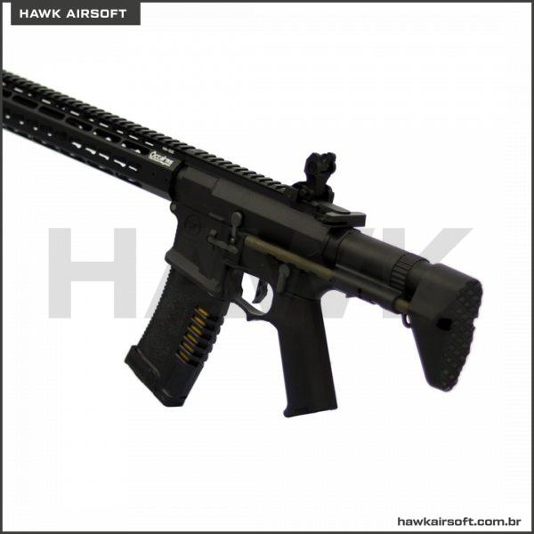 O sistema Rail Octarms usa o sistema keymod com slots nas 3, 6, 9 e 12 horas do trilho. A ARES também lançou o sistema Rail individualmente com muitos acessórios adicionais que podem ser aplicados a ele. Ele dispara em um constante 410 FPS, que é uma grande arma ao ar livre para usar, testado com um tipo 7.4V Grande Tamiya de bateria. Embora provavelmente possa levar 11.1V nós não o sugerimos até que você mude as partes internas para poder lidar com a pressão aumentada. Os modos de tiro desta arma são semi auto ou full auto para chover o BB’s contra a sua oposição. As vistas são fáceis de abrir e recuar onde a coronha pode ser removida com a velocidade para a qual foi projetada.