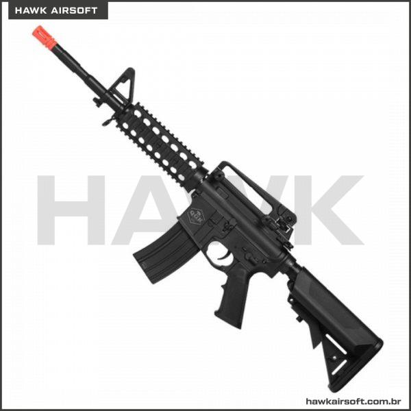 Sistema: Elétrico (AEG) Modo de disparo: Semi/Auto/Safe Blowback funcional: Não Capacidade do magazine: 300 rds Velocidade fps: 300 com 0.20 Distância aproximada: 50 mts Peso: 1950 g Comprimento: 800/880 mm Altura: 240 mm Calibre: 6 mm Versão gearbox: V2 Hop up ajustável: Sim Material hop up: Polímero Fiação da bateria: Traseira Material do cano externo: Polímero Material gatilho: Metal Material da armação: Polímero Material do carregador: Polímero Massa de mira: Sim Alça de mira: Sim Trilho superior: Sim Trilho inferior: Sim Zarelho para bandoleira: Sim